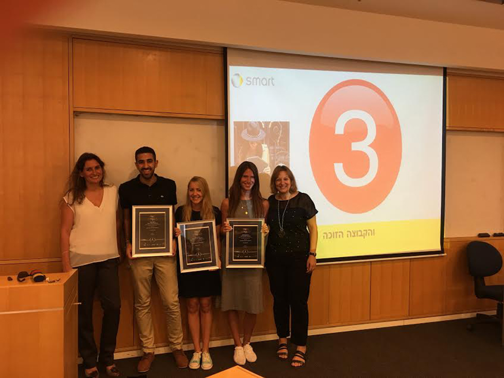 נראו נרגשים: דנה רביד מנחם, מנהלת השיווק של מרצדס וסמארט, ד"ר טליה רימון, ראש ההתמחות ומרצת הקורס, והסטודנטים הזוכים: ליאת פטרושקה, שקד לרנר, ועארף בשיר.