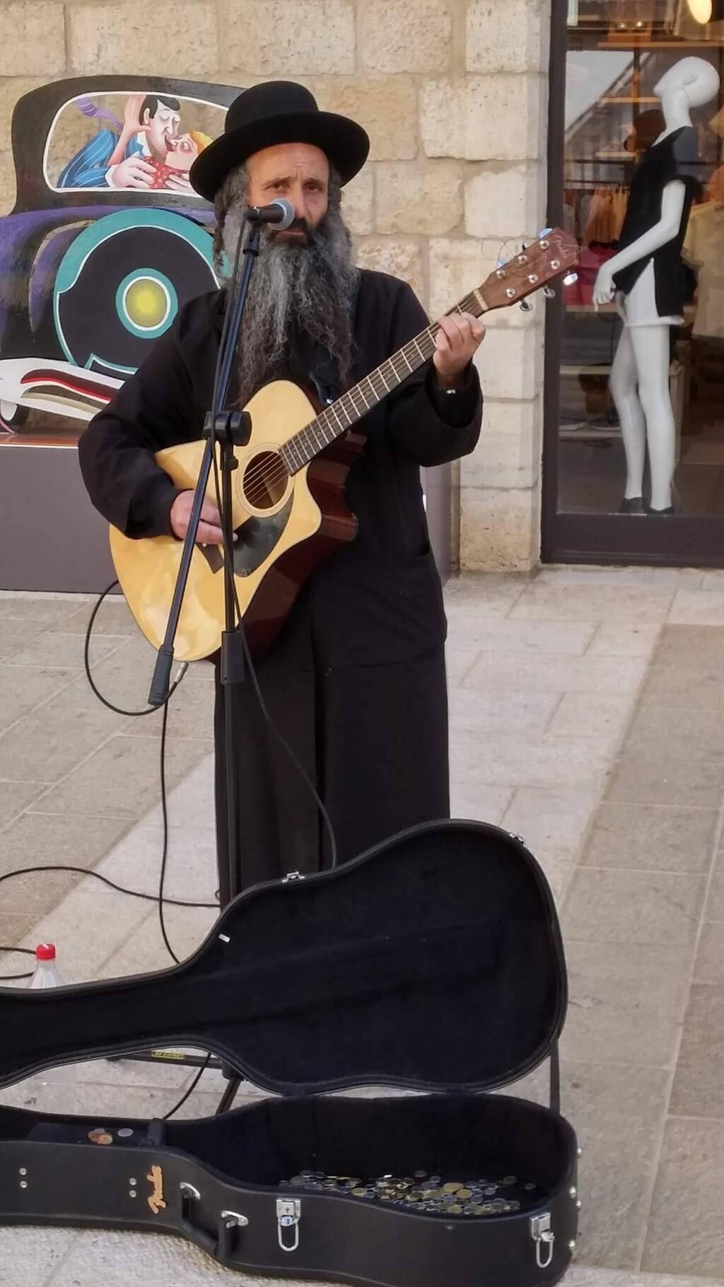 Ортодоксальный еврей с гитарой красиво поет для прохожих, повернувшись спиной к светским соблазнам: