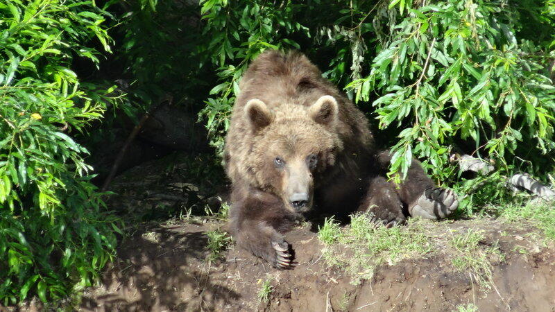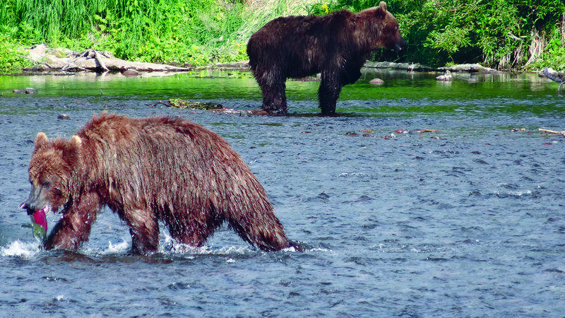 Утром поход к медведям. Десяток громадных животных в 20-30 метрах от нас ловят нерку. Сдирают одним взмахом шкуру с рыбы, и раздается громкий хруст. За день камчатский медведь съедает около 25 кг нерки. Медведи на людей внимания не обращают, но на всякий случай около нас человек с ружьем, который вскидывает винтовку при каждом приближении косолапого.