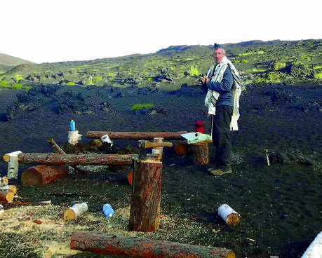 Сам подъем прекрасен: вокруг разноцветные скалы, лед, снег, ручьи, яркое солнце, +18. Правда, в мои 64 года подняться на 1800 метров за один день уже нелегко. 24 километра по лаве и снегу дают себя знать: на вершине я сижу без сил. Успокаиваю себя тем, что Беня с Ороном не смогли пройти и половины пути.