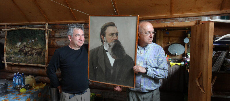 Идем на роскошный ужин в столовую. Поварихи расстарались: приготовили рассольник, минтай, кальмаров (не для Гэри), винегрет. На стенах столовой висят шкуры убитых медведей и лосей, громадные рога оленя и портрет Энгельса. Друзья спрашивают, кто это такой, мы с Димой тут же отвечаем. Хозяева потрясены – за последнее время никто из гостей не смог определить героя портрета.