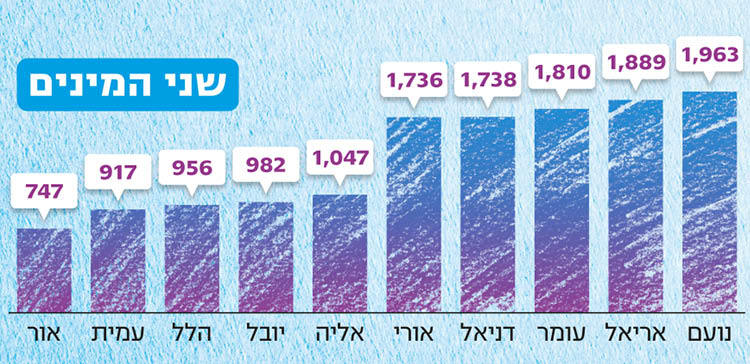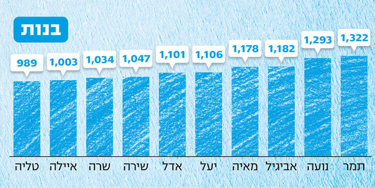 מבין השמות הנפוצים שניתנו הן לבנים והן לבנות צועדים בראש השמות נועם במקום הראשון, אריאל בשני, עומר בשלישי ואחריהם דניאל, אורי, אליה, יובל, הלל, עמית, ואור במקום העשירי. השם שחר, שנמצא במקום ה־18, הוא השם הכי שוויוני — 51% מהנושאים אותו הם בנים, ו־49% הן בנות.