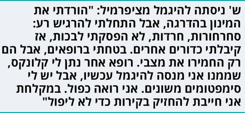"בעלי, שראה את הסבל שלי, אמר לי שאם ככה אני מרגישה בלי התרופה, עדיף לא לעבור את הסבל הזה שוב בעתיד. ההרגשה הרעה חלפה אחרי כמה שבועות, אבל במשך חודשים רבים עוד סבלתי מהתקפי חרדה ובכי שהגיעו בלי שום סיבה".