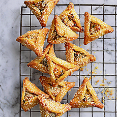 מה חשבנו? אוזני המן מלוחות על בסיס בצק פריך ומלוח, מצופות בשומשום בשילוב בטטה, מנגולד, גבינות ובצל צלויים. לחובבי הבורקסים. טעים!