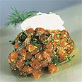 - מגישים במנות אישיות (אפשר בכוסות יין קטנות, קעריות שקופות או אפילו כוסות אספרסו), ונעזרים בשתי כפיות להנחת כפית קרם פרש או שמנת על כל מנה. מעטרים במעט עירית קצוצה, שמיר טרי או אפילו צלף שלם.
