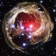 אומנות חללית: טלסקופ החלל "האבל" העביר צילום מדהים ובו נראית הילת אבק עצומת מימדים, המקיפה ענק אדום וכמה כוכבים זוהרים במרכזה.