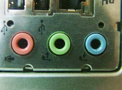 כעת ניגש לחיבורי הסאונד: חפשו באחורי המחשב כרטיס שעליו לפחות שלושה חורים צבעוניים: ירוק, כחול ואדום (הסדר עשוי להשתנות), הזהים בצורתם לחיבורים הקיימים בנגן MP3 נייד או דיסקמן, ואליהם מתחברת האוזניה. אל אחד מהם, הירוק, אמורים להיות מחוברים רמקולים, ואצל חלקכם יהיה חיבור נוסף, בשקע האדום, ששייך למיקרופון.