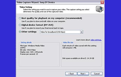 עדיף לבחור באיכות הגבוהה ביותר האפשרית - dv-avi - משום שתמיד ניתן להמיר את הסרט לאיכות נמוכה יותר, אך לא תוכלו לשפר איכות. בעקבות בחירתכם, התוכנה תעביר את הסרטים מהמצלמה למחשב, ואף תחלק אותם למקטעים, לפי הסדר בו צולמו. יש לשים לב, כי שעה של סרט באיכות מלאה (dv) תסתכם ב-13 גיגה בייט בדיסק הקשיח.
