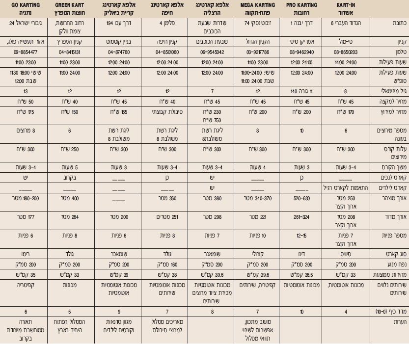 כל-כך הרבה מסלולים במקומות שונים, עשויים לבלבל את המעוניין בהתנסות ראשונית. ומי שכבר ניסה ומעוניין לגוון, לא תמיד יודע היכן בדיוק ניתן לנהוג. לכן החלטנו לבדוק עבורכם את מסלולי הקרטינג של מדינת ישראל. לא רק לספר לכם היכן הם נמצאים וכמה זה עולה, אלא לבדוק אותם על כל המשתמע מכך. איך מגיעים, איפה חונים, איזה שירותים יש במקום וכמה מהנה לנהוג. באיזה כלים מדובר, מה אורכו האמיתי של המסלול (בניגוד לפרסומים הרשמיים), ואפילו נהגנו על המסלולים השונים, כדי לתת לכם הערכה על זמן ההקפה הממוצע והמהיר ביותר.