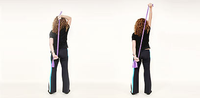 התרגיל: קחי גומייה, אחזי אותה בשני קצותיה מאחורי הגב, כשיד אחת ממוקדת במותנית (שקע הגב התחתון), והיד השנייה כפופה מעל הראש. משכי את הגומייה שמעל הראש בקו ישר למעלה, כשהמרפק משמש כציר, עד שהיד מתיישרת (15 פעמים). שחררי לאט ובהתנגדות. חזרי על התרגיל כשהפעם את מושכת את היד התחתונה בקו ישר למטה ושחררי בהתנגדות (15 פעמים). חזרי על התרגיל בשתי הידיים יחד ושחררי לאט לאט (15 פעמים).