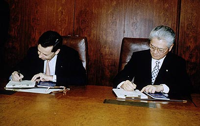 יו"ר ניסאן, יושיקזו הנווה (ימין) ויו"ר רנו לואי שוויצר במעמד חתימת הסכם שיתוף הפעולה. בישראל חלקו המותגים בית משותף עוד קודם, אצל קרסו...