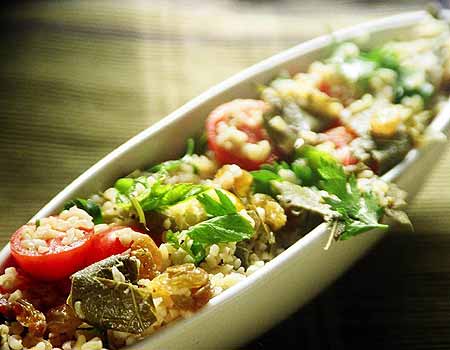 סלט בורגול, עלי גפן, צימוקים, עשבי תיבול ועגבניות שרי