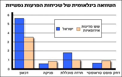 המרכזית לסטטיסטיקה בשנים 2003-2004. הוא נועד כדי לאמוד את העומס שמחלות אלה עשויות להטיל על הפרט, על המשפחה, ועל החברה. הסקר הוא חלק מפרוייקט בין-לאומי שמוביל ארגון הבריאות העולמי במטרה להרחיב את המידע על תחלואה נפשית באוכלוסייה הכללית. מהנתונים עולה כי שיעור הדיכאון והחרדה בישראל גבוהים מהשיעורים באירופה. עם זאת, שיעור הפאניקה ושיעור ה"הלם קרב" מעט נמוכים מאלה שבאירופה.