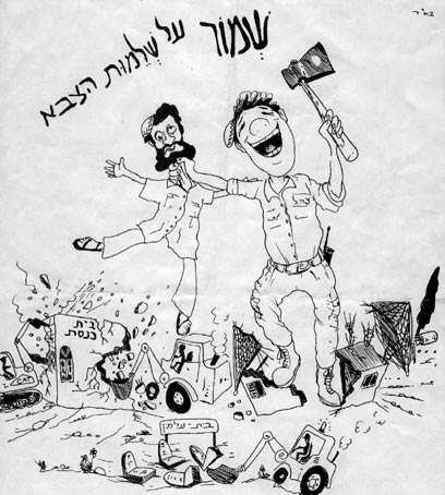 קריקטורה בימין: חייל מניף גרזן על מתנחל