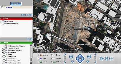תמונת לוויין של איזור מרכז הסחר העולמי במנהטן, בתוספת שכבת בניינים