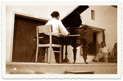 "... לעת ערב, הגיעו החברים לבושים בחולצות לבנות ולקול תשואותיהם הרמות נכנס לחדר האוכל פרנק פלג והחל לפרוט על הצ'מבלו מיצירות בך, הנדל ומוצרט, וגם אטיוד של שופן...לאחר ההפסקה, כאשר החל פלג לנגן את ה'מולדבה' של סמטנה נפסקו יריות הערבים.