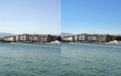 הוספנו לתמונה שמיים כחולים יותר באמצעות אפקט גוון הדרגתי (ז'נווה, שווויץ, 2005)