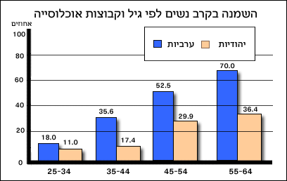 המעבר מתזונה מסורתית לתזונה מערבית והיעדר הסברה גרמו לבעיית השמנה בציבור הערבי, בעיקר בקרב הנשים המבוגרות. 70% מהנשים ערביות בנות 55-64 סובלות מהשמנה לעומת 36.4% מהיהודיות. אצל הגברים הפערים מורגשים בגיל הילדות טובקרב הגברים המבוגרים. שיעור ההשמנה בקרב גברים ערבים בני 55-64 עומד על 31.5% במגזר היהודי הוא עומד על 20.1%.