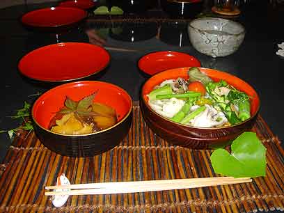 אנחנו מצויות בחדר האירוח של המקדש השמור לאורחים רמי דרג. שאר הנזירים ודרי המקדש שרויים כעת בחדר האוכל שלהם, מסודרים בסדר היררכי: הבכירים בראש, הזוטרים במאסף, סביב שולחן ארוך ארוך. אנחנו בתור אורחות זוכות לכבוד מלכים ואוכלות בחדר מיוחד, מין ארוחת טעימות גורמה ששינטאקו סאן רקח במיוחד בשבילנו. אנחנו מסתכלות על יעל, בעיקר כי אנחנו לא יודעות בדיוק מה לעשות - איך לאכול, ובאיזה קצב, וזה קצת מלחיץ אותנו כי אנחנו לא רוצות לפגוע ברגשותיהם של המארחים שלנו, שיוצאים מעורם כדי להנעים את זמננו.