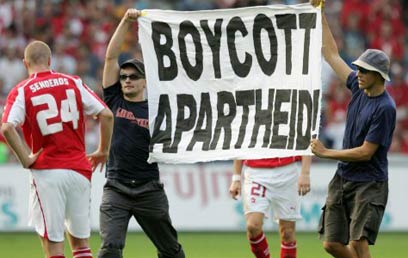 השלטים שהניפו הפורצים למגרש: "החרימו האפרטהייד" (צילום: רויטרס)