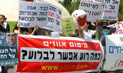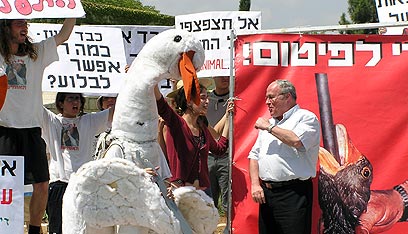 בשעה שוועדת השרים דנה בתקנות הפיטום, הפגינו בירושלים כמה עשרות פעילים של הארגון למען זכויות בעלי החיים "אנונימוס". המפגינים הציבו בובת אווז מול משרדי הממשלה ונשאו שלטים "אל תתנו ידכם לחוק עוקף בג"ץ" וגם "לא יתעלל אדם בבעלי חיים". דוברת אנונימוס, רעות הורן, אמרה ל-ynet: "הפסיקה של בג"ץ נכנסה לתוקף ב-1 באפריל 2005 ומאז ממשיכים לפטם ומשרד החקלאות מנסה לעגן את הפשיעה בחוק. רוב המדינות הוציאו את זה מחוץ לחוק. חוק צער בעלי חיים קובע שאסור להתעלל באווזים ובג"ץ קבע שזו התעללות".