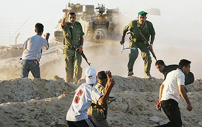 הסבלנות הפלסטינית פוקעת, בדרך להתנחלויות המפונות: קבוצה של כ-40 צעירים פלסטינים צעדה הערב (יום ג') ליד חאן יונס, באזור היישוב נווה דקלים. הצעירים הפלסטינים נשאו דגלי חמאס ירוקים ודגלי אש"ף, זרעו הרס בגדר ההתנחלות, השליכו אבנים וטיפסו על טנק ישראלי. מצה"ל נמסר כי לעבר הצעירים בוצע בתגובה רק ירי אזהרה אולם הפלסטינים מדווחים על הרוג אחד ושלושה פצועים.