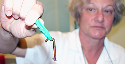 אחות בית החולים, אוחזת בעלוקה (צילום: רוני אלברט)