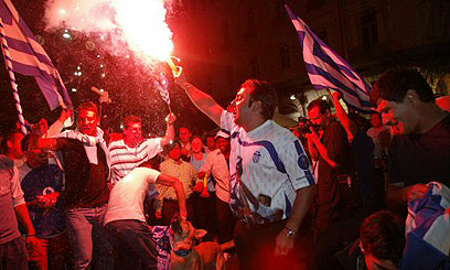 אוהדים יוונים חוגגים את הזכייה באתונה (צילום: רויטרס)