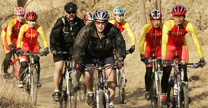 עיתונאים רבים ליוו היום (א') את הנשיא בוש, כשפתח את הבוקר שלו ברכיבה על אופני הרים בפארק בפאתי בייג'ינג, כשלצידו רוכבים חברי הנבחרת האולימפית הסינית. הנשיא, העושה בסין בביקור רשמי, החליף את החליפה והעניבה במעיל רוח ומכנסי רכיבה, וביקש מהאתלטים הצעירים שלצידו "לרחם על הבחור המבוגר...".