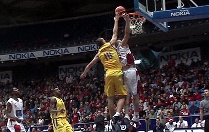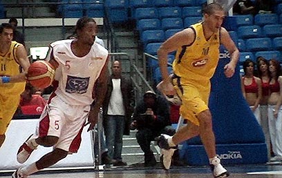 ניקולה וויצ'יץ' נאבק בארנסט בראון מתחת לסל (צילום: יועד כהן)
