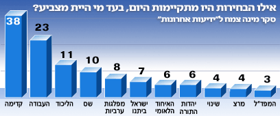 הסקר גם בדק, כמו שצפוי לנו בכל סוף שבוע עד הבחירות, את מצבן של המפלגות בקלפי לו הבחירות היו מתקיימות היום. קדימה בראשות שרון רושמת בסוף השבוע בסקר "רק" 38 מנדטים - ירידה של שלושה מנדטים לעומת הסקר שנערך שלושה ימים קודם. מפלגת העבודה עולה חזרה בשני מנדטים, ומגיעה שוב ל-23. ואילו הליכוד ממשיך לדשדש עם 11 מנדטים.