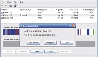 2. לחצו על הכונן אותו תרצו לאחות, תלחצו על החל ניתוח. Windows תנתח את מצב הדיסק ותחליט אם הוא צריך לעבור איחוי קבצים או לא. תיבת שיח תופיע לכם, שתאפשר לכם לראות את דו”ח מצב הדיסק הקשיח, תמשיכו עם האיחוי או שתחזרו לחלון מאחה הדיסק.