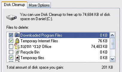1. לחצו על “התחל” -> כל התוכנות -> עזרים -> כלי מערכת -> ניקוי הדיסק. (תופיע תיבת שיחה שבה תוכלו לבחור את הכונן הרצוי)