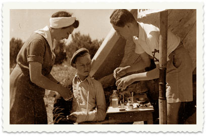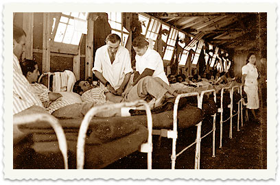 בית חולים נוסף, כנראה צבאי, אולי בסרפנד (מחנה צריפין - נ.מ.). דגל בריטניה על תקרת הצריף.