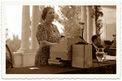 גולדה מאירסון נואמת בטקס (אולי בירושלים), על הדגל: "והתנחלתם את הארץ" (ראו תמונה בצד ימין).