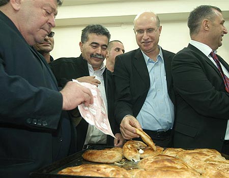 ברוורמן, פרץ ובן אליעזר אוכלים בורקס בלוד. צילום: ירון ברנר