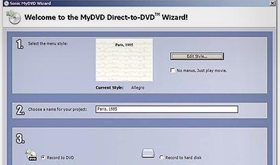 אשף Direct-To-DVD ב-MyDVD מאפשר לבחור שם פרויקט, סגנון תפריטים ואפשרויות הקלטה