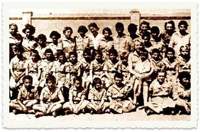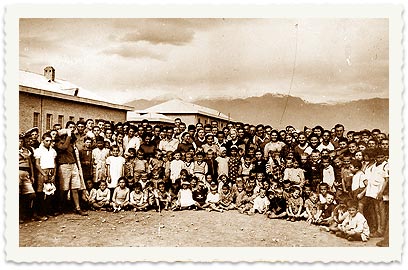 צילום קבוצתי של מדריכים במחנה. במרכז יושבת ציפורה שרתוק ולשמאלה עזיז אל-קנין, יהודי מקהילת טהרן שארגן סיוע לילדים וכונה "המציל מטהרן".