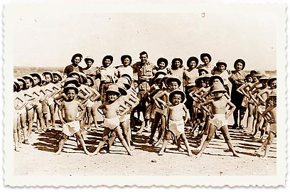 התעמלות בוקר בחום הנורא של קראצ'י, חבושים בכובעי השעם שהעניקה להם משפחת ששון מבומבי. הודו, 1943.