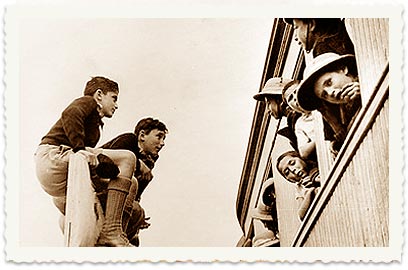 קבלת הפנים. מפגש ראשון בין ילדי טהרן לילדי ארץ-ישראל. תחנת הרכבת ברחובות, 18 בפברואר, 1943.