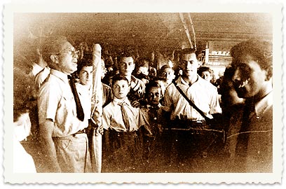 שרים התקווה ומניפים את דגל ישראל על סיפון האניה "נאורליה". משמאל, אוחז בדגל - רודניצקי, נציג הסוכנות היהודית בטהרן. מימין - דוד לאונברג-לאור, מפקד המסע.