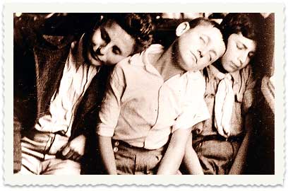 ברכבת לישראל. עייפים מהמסע. מימין לשמאל: יהודה בירנר ז"ל, אורי גפן ומשה שיין. המסע מהמחנה בטהרן למצרים נמשך כחודש וחצי ובמהלכו נפטרו שבעה ילדים.