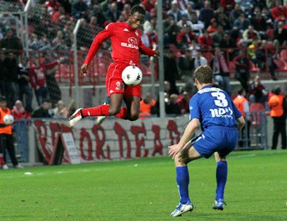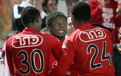 אובוקה, אוגבונה ופנטסיל חוגגים את שער היתרון, הערב (צילום: אלי אלגרט)