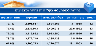 אם בודקים כיצד הצביעו הישראלים מאז קום המדינה, מתגלה נתון מעניין. אחוז המוותרים על זכות הבחירה עולה ממערכת בחירות אחת למשניה (ראו טבלה). בעוד שבבחירות הראשונות ב-49' רק 13 אחוז העזו שלא להגיע לקלפי, הרי שבבחירות האחרונות, ב-2003, הגיע שיעורם ל-32 אחוז.