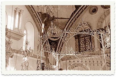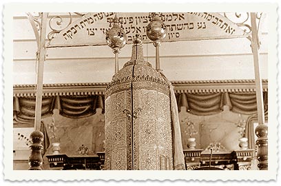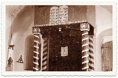 בית כנסת בוכרי. מעל הבימה כתוב: "זאת הבימה התנדבה האשה הנכבדה והצנועה מרת רבקה אלמנת מוציון פינחסוף נע בהשתדלות מואלעזר קאזי סיון תרע"ב"