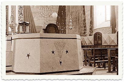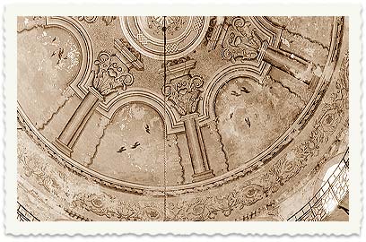 כיתוב על הבמה: "..במה זו הוקמה מחדש.. הגביר רב הפעלים.. ישראל אהרון בר נחמן המכונה מר הרי פישל ורעיתו הגברת מרת.. מינה.. בת שמעון הנגיד מניורק…"