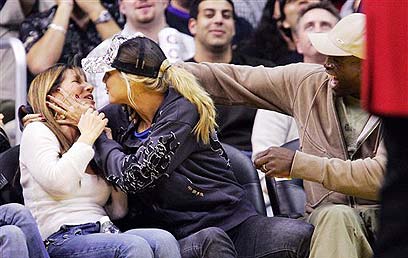 אשה לא מזוהה מנשקת את היידי קלום, במשחק של הלייקרס (צילום: איי פי)