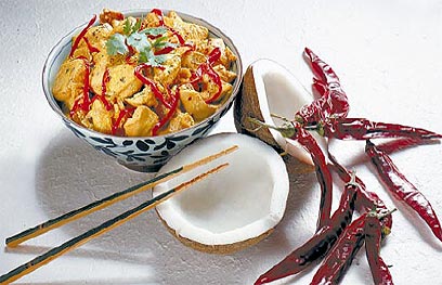 - מוסיפים את חלב הקוקוס ומביאים לרתיחה. מנמיכים את הלהבה, מכסים את הסיר ומבשלים 25 דקות, עד שהעוף רך מאוד. טועמים את הרוטב ומתקנים את התיבול. מערבבים פנימה את הכוסברה. אוהבי החריף יכולים להוסיף רצועות פלפלת מטוגנת. מגישים עם אורז לבן.