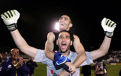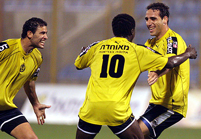 איסיאקו (מספר 10) חוגג עם שלומי טולדו ורג וולק (גלעד קוולרצ'יק)