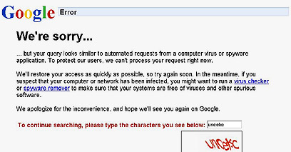 בשבועות האחרונים נתקלים יותר ויותר גולשים ישראלים של "גוגל" בהודעת השגיאה בתמונה המוצגת כאן. הודעה זו מוצגת כתוצאה של כל חיפוש, ואינה מאפשרת להמשיך להשתמש במנוע החיפוש.